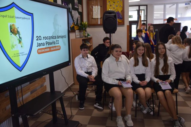 Z uwagi na fakt, iż uczniowie – dzieci i młodzież – znają Jana Pawła II jedynie z opowiadań, zdjęć oraz piosenek, p. dyr. Ewa Brodziak została poproszona o podzielenie się swoimi refleksjami związanymi ze śmiercią oraz pogrzebem naszego Patrona. Dyrektor szkoły z łezką w oku oraz drżącym głosem opowiedziała o tamtych smutnych wydarzeniach sprzed 20 lat w naszej szkole, wspomniała o wzruszających wpisach w księdze kondolencyjnej, a także przeczytała wstęp ze zbiorku poetyckiego zawierającego wiersze naszych dawnych uczniów, ich rodziców oraz nauczycieli, aby w ten sposób podkreślić niezwykłość Ojca Świętego. Wybrane trzy utwory z tego tomiku zaprezentowały uczennice klasy VII.