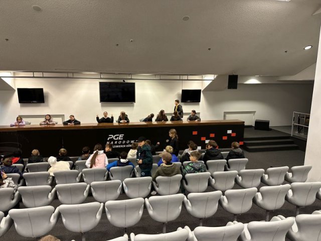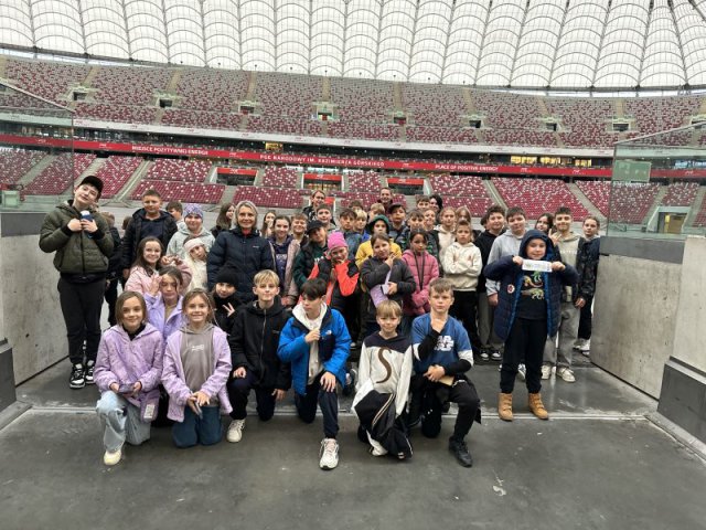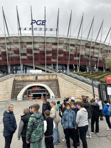 Obiad zjedzony na Starówce był smaczny i pożywny, choć niektórzy udawali, że nie są wcale głodni i niecierpliwie czekali na następny punkt wycieczki. Bardzo duże wrażenie wywarł Stadion Narodowy. Wielu z nas było tu po raz pierwszy. Widok potężnego obiektu, który znany nam jest z mediów, wzbudzał wielką ciekawość. Zobaczyliśmy wnętrze stadionu, ogromną iglicę i telebimy przy kopule, pracowników myjących okna od wewnątrz na wysokim podnośniku, tysiące krzesełek dla widowni i kibiców, szatnię, łazienkę, prysznice, sale relaksu przeznaczoną dla piłkarzy i zawodników, koszulki piłkarzy, zdjęcia, puchary, piłki, buty piłkarskie, ławkę rezerwowych. Oprócz tego salę konferencyjną, miejsca dla dziennikarzy, reporterów, sprawozdawców, kawiarenki, restaurację, garaże…. - ogrom obiektu, ogrom możliwości i ogrom naszych wrażeń.