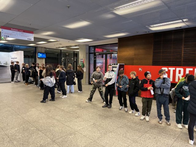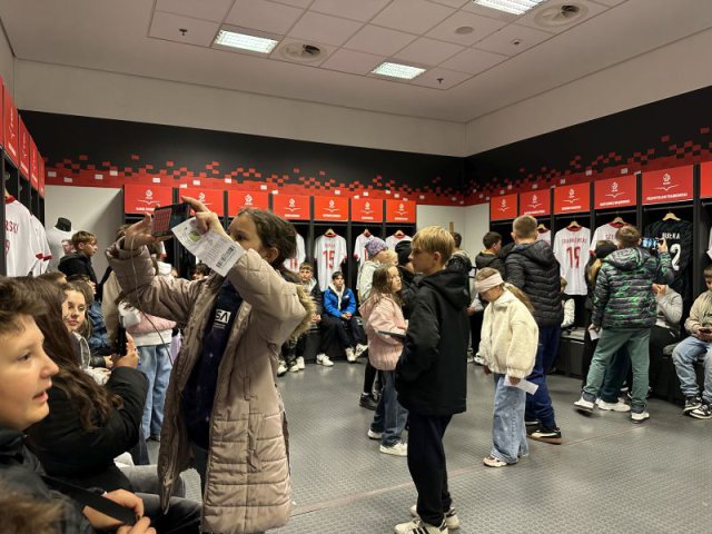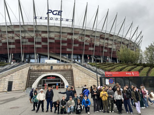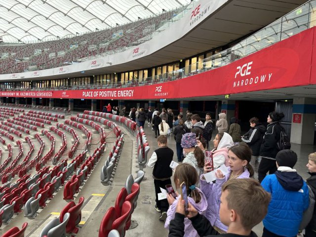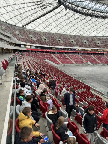 Obiad zjedzony na Starówce był smaczny i pożywny, choć niektórzy udawali, że nie są wcale głodni i niecierpliwie czekali na następny punkt wycieczki. Bardzo duże wrażenie wywarł Stadion Narodowy. Wielu z nas było tu po raz pierwszy. Widok potężnego obiektu, który znany nam jest z mediów, wzbudzał wielką ciekawość. Zobaczyliśmy wnętrze stadionu, ogromną iglicę i telebimy przy kopule, pracowników myjących okna od wewnątrz na wysokim podnośniku, tysiące krzesełek dla widowni i kibiców, szatnię, łazienkę, prysznice, sale relaksu przeznaczoną dla piłkarzy i zawodników, koszulki piłkarzy, zdjęcia, puchary, piłki, buty piłkarskie, ławkę rezerwowych. Oprócz tego salę konferencyjną, miejsca dla dziennikarzy, reporterów, sprawozdawców, kawiarenki, restaurację, garaże…. - ogrom obiektu, ogrom możliwości i ogrom naszych wrażeń.